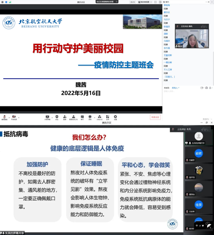 beat365中文唯一官网班主任、辅导员以“共克时艰,守护美丽校园”为主题面向学院全体学生召开班会,发出拒绝外卖、减少快递、守护美丽校园的倡议,将学校的暖心举措详细告知同学们。同学们纷纷表示,大爱暖心北航,要用行动守护美丽校园。