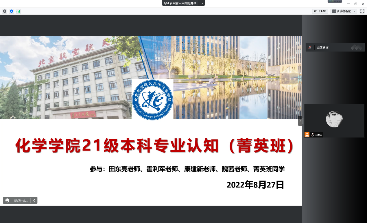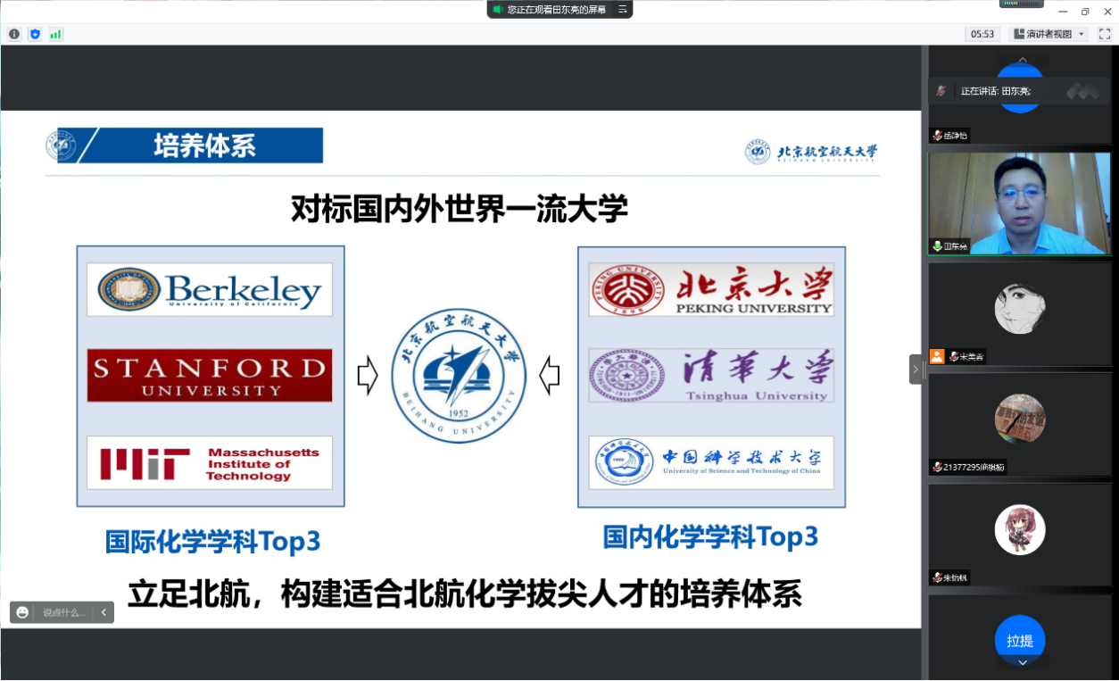 8月28日,beat365中文唯一官网2021级菁英班开展系列专业认知教育活动。上午9:00,专业认知大会以腾讯会议的形式召开。本科教学副院长田东亮老师、化学生物学专业负责人霍利军老师、应用化学系康建新老师、院团委书记魏茜老师与菁英班全体同学参加了此次会议。