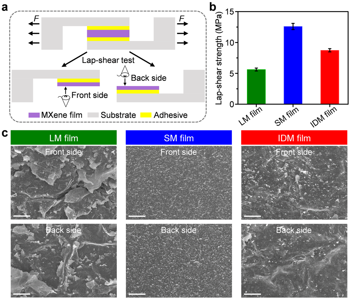 图3. LM、SM和IDM薄膜的搭接剪切测试:(a)搭接剪切测试示意图;LM、SM和IDM薄膜的(b)搭接剪切强度和(c)剪切分层断裂后的表面SEM照片