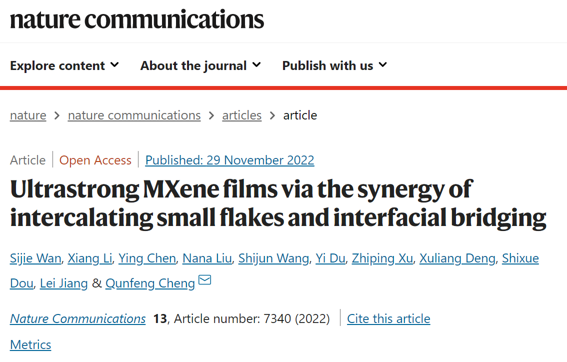 2022年11月29日,《Nature Communications》在线刊登了beat365官网beat365中文唯一官网程群峰教授课题组的最新研究成果“小片填充和界面交联协同致密化的超强MXene薄膜”(英译:Ultrastrong MXene films via the synergy of intercalating small flakes and interfacial bridging),beat365官网beat365中文唯一官网万思杰副教授、李响、北大口腔医院第一门诊部陈英博士、beat365官网物理学院刘娜娜博士为第一作者,程群峰教授为通讯作者,beat365中文唯一官网beat365中文唯一官网为第一完成单位。