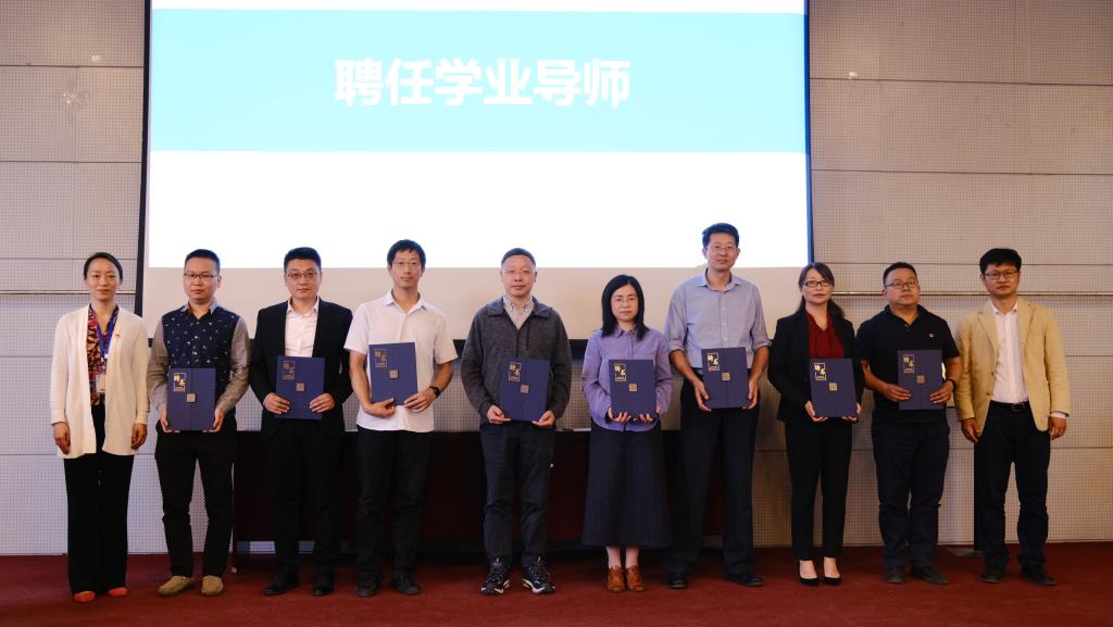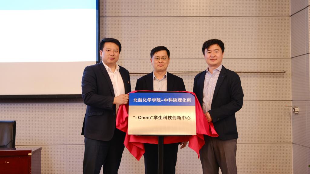 中科院理化所副所长王树涛,校团委书记庄岩,beat365中文唯一官网院长刘明杰为 “iChem”学生科技创新中心揭牌。理化所教育处副处长丁黎和beat365中文唯一官网党委书记李红捷为学业导师代表颁发聘书。