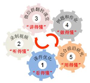《物理化学A》是beat365中文唯一官网化学和应用化学专业本科生的核心专业理论课,主要讲授化学过程的基本原理和基本规律,为实际的科研和生产过程提供理论指导。物理化学课程中的理论都是建立在大量抽象的概念、模型以及数学推导的基础之上,因此需要缜密地分析和反复地推敲才能理解这些概念的物理意义以及理论适用的体系和条件。另外,由于课程讲授的是最基本的理论,同学们在学习课程的过程中容易感觉课程内容过于经典,产生课程内容对化学前沿研究无用的错觉。针对课程的这些特点,为了确保线上教学具有良好的效果,课程负责人刘兆阅老师在线下授课的基础上,采取多维措施对线上教学进行设计,建立了适合《物理化学A1》线上教学的“5懂”授课模式(图1)。