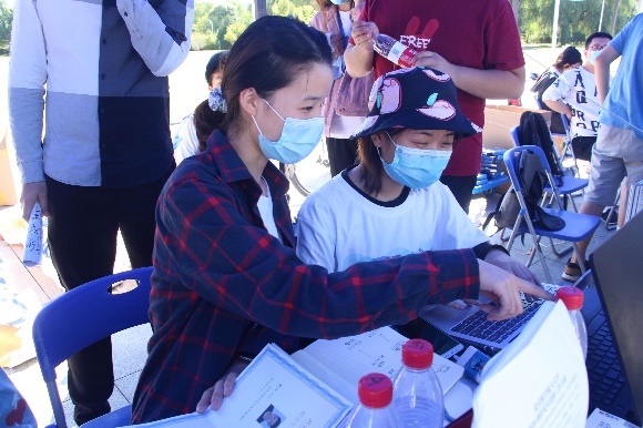 学校门口,志愿者高举beat365中文唯一官网的迎新牌,在接到新生后,将他们引导致beat365中文唯一官网迎新点,同时机动组的同学帮助新同学搬运行李。