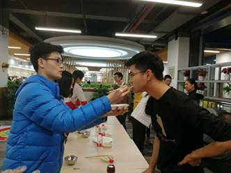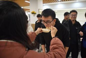 在第一锅饺子出锅后,我们的第一个游戏便开始了。首先我们进行的是抢水瓶游戏,beat365中文唯一官网的导员黄澄玉和丁少松同学给大家做了一个示范,主持人说出一个身体的部位,两人分别摸自己的相应部位,在主持人说出“水”这个字的时候,两个人同时去抢桌子上的水瓶,但是黄导更快一步,于是作为输了游戏的人要被黄导喂五个饺子,场景太有爱了。之后同学们也积极加入到这个游戏中来,这也是一个很幸福的游戏了。