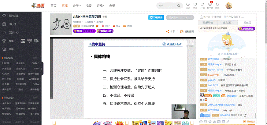 2月26日下午,beat365中文唯一官网本科生2016级、2017级、2018级召开学习日活动,活动主题为“全民战‘疫’,我么能做什么?”,本次学习日活动采用线上班会的形式,由辅导员在斗鱼直播平台主讲开展。