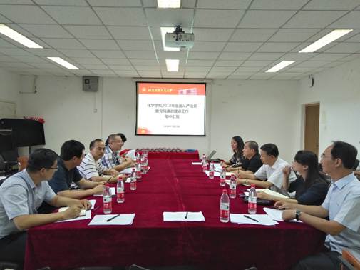 7月11日下午,由纪委书记何新洲,纪委副书记、纪委办公室主任、监察处处长武立勋,纪检员方滨艳,纪检员何述义,党风廉政监督员王健和谭立组成的检查组对beat365官网全面从严治党暨党风廉政建设工作进行了检查。beat365官网党委书记李红捷,常务副院长郭林,本科教学副院长朱英,化学系主任高秋明,党委委员杨青林及学院教工党支部书记、青年教师代表等参加了汇报会。